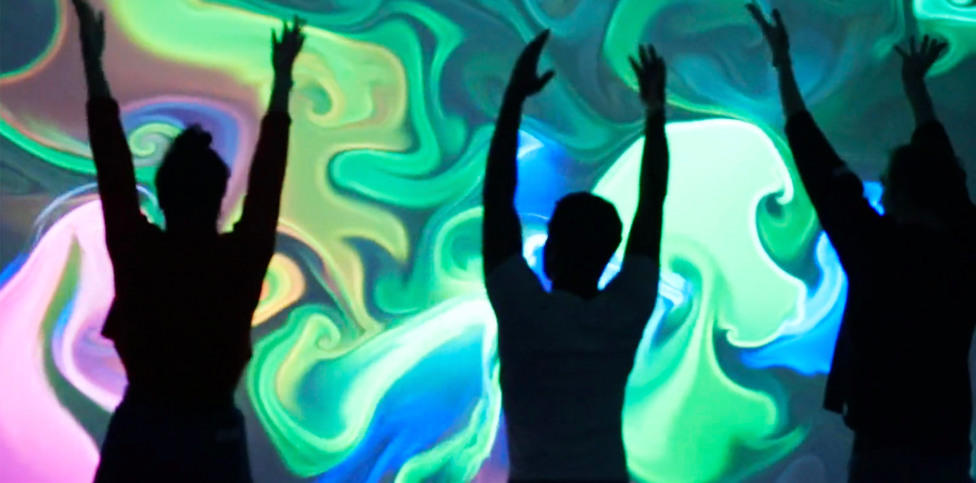 As a part of the 100th Anniversary festivities at Rochester Museum & Science Center, our team installed a multi-user interactive installation at the Imagination Celebration that translated body movement into reactive patterns and colors. Each individual response was programmed to affect the adjacent animation, creating layers of effects.